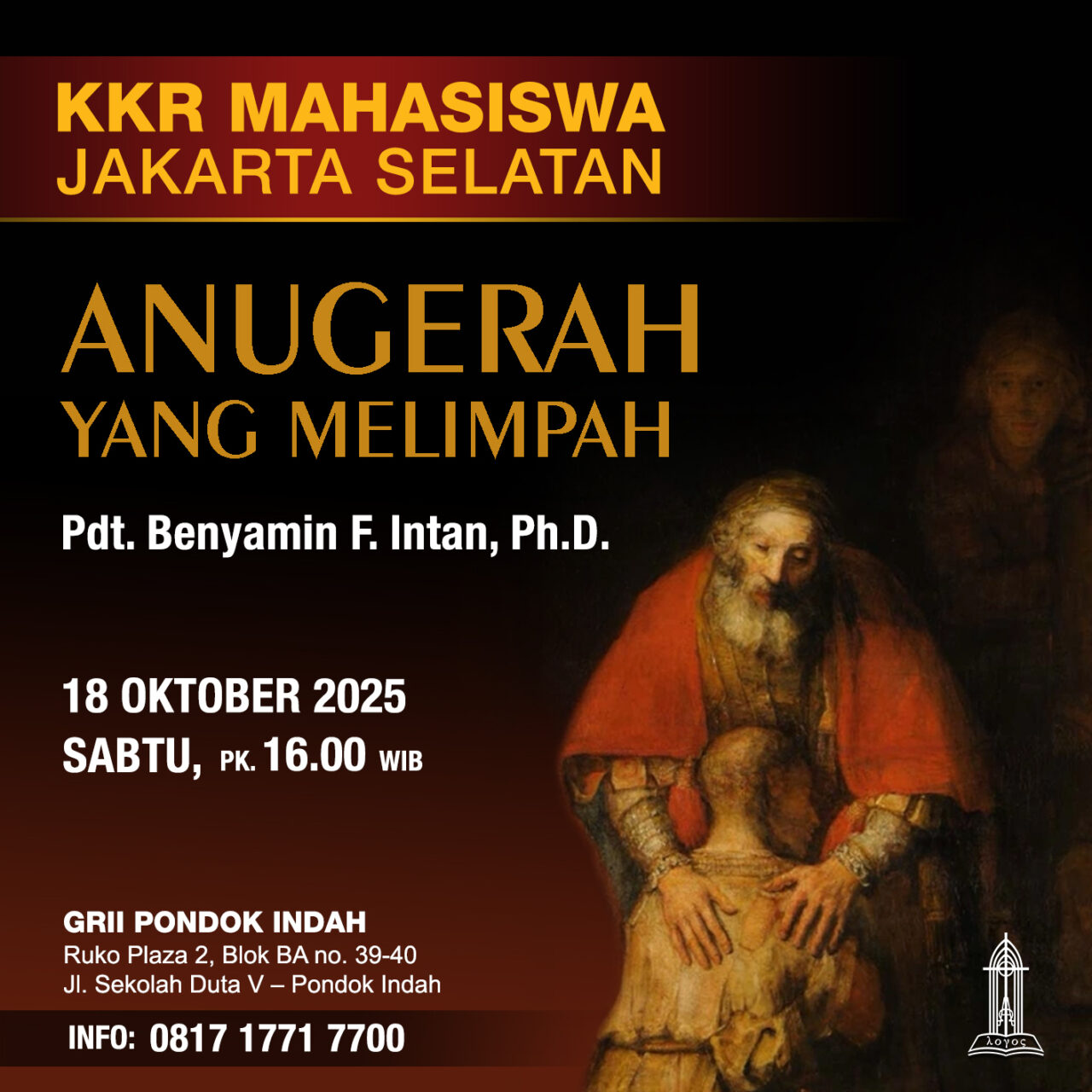 KKR MAHASISWA JAKARTA SELATAN GRII PONDOK INDAH 2025 Pdt. Benyamin F. Intan, Ph.D. Sabtu, 18 Oktober 2025 pk. 16.00 WIB